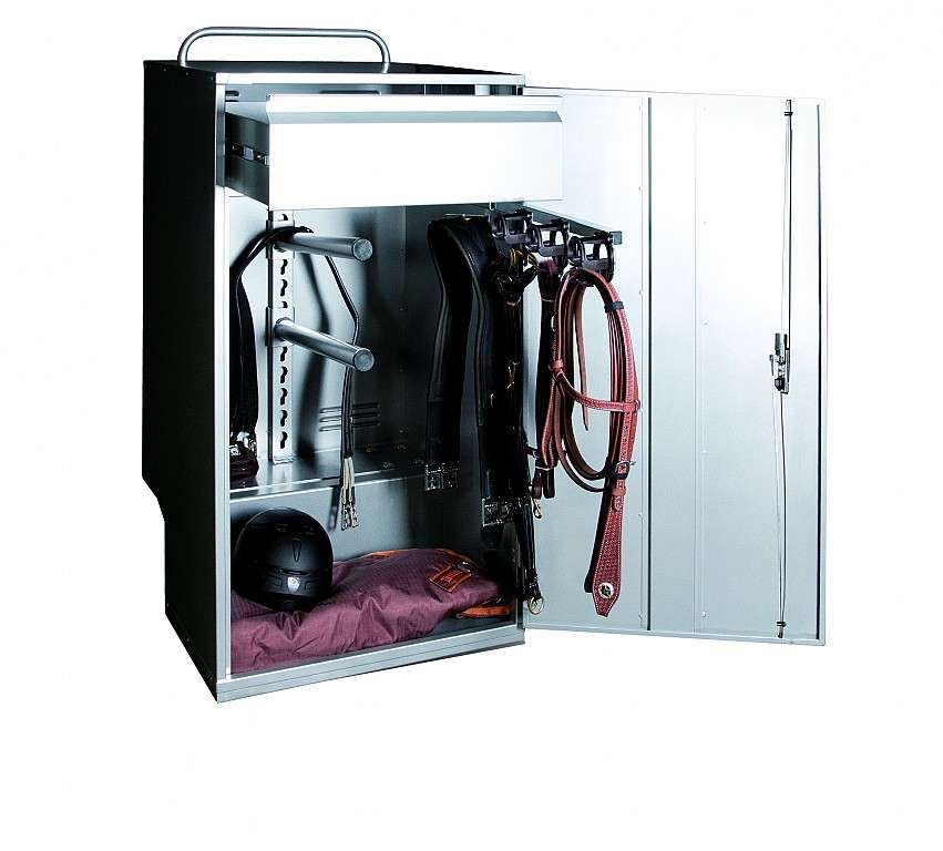 Hátulján fogóval és 2 tömör gumi kerékkel a könnyű mozgatáshoz, kihúzható 3-as kantárakasztóval és fiókkal.